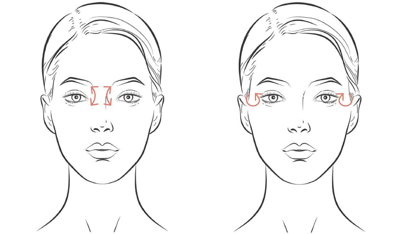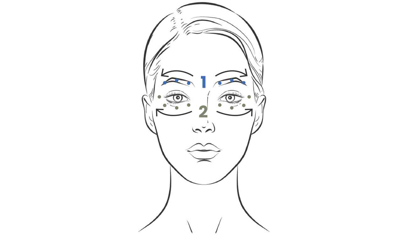 - 3 Tupfen auf das Oberlid und 3 unter jedes Auge. Massiere die Augenpartie von innen nach außen und befolge dabei die CREMA NERA Massage-Handgriffe.